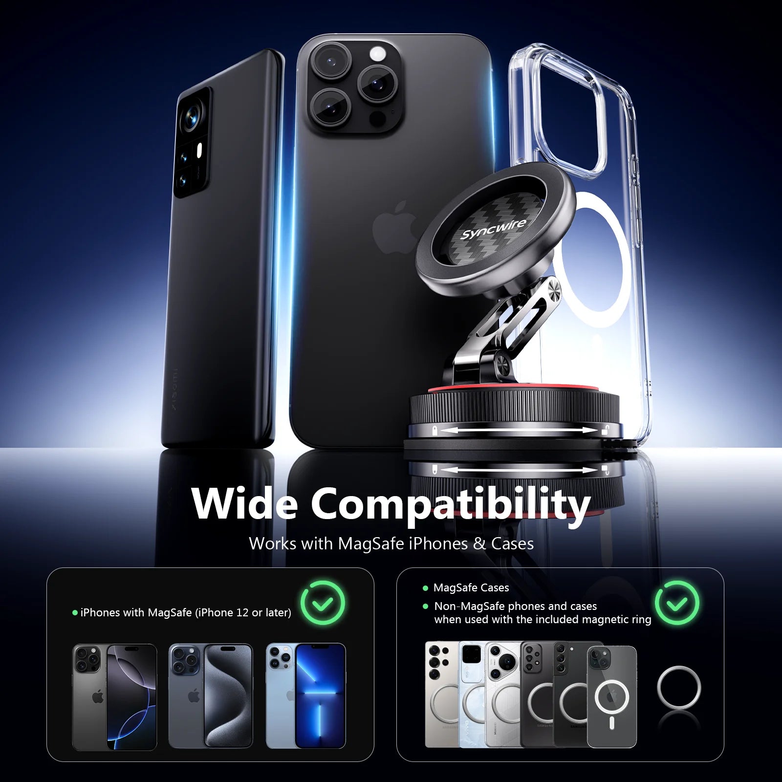- Universelle Kompatibilität mit den mitgelieferten Magnetringen: Besitzen Sie ein nicht-magnetisches Smartphone oder eine nicht-magnetische Hülle? Kein Problem. Wir legen zwei stylische Magnetringe (1 schwarz + 1 weiß) bei, die Sie einfach an Ihrem Gerät oder Ihrer Hülle befestigen können. So wird jedes Smartphone schnell und unkompliziert MagSafe-kompatibel.