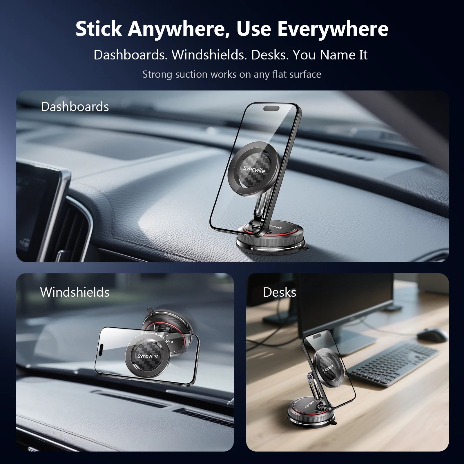 - Mit zusätzlichem Klebepad für unebene Oberflächen: Inklusive starkem Klebepad – ideal für leicht strukturierte oder unebene Armaturenbretter, Windschutzscheiben oder sogar Schreibtische. Bringen Sie zuerst das Pad an und installieren Sie dann den Saugnapf für maximale Stabilität in jeder Umgebung.