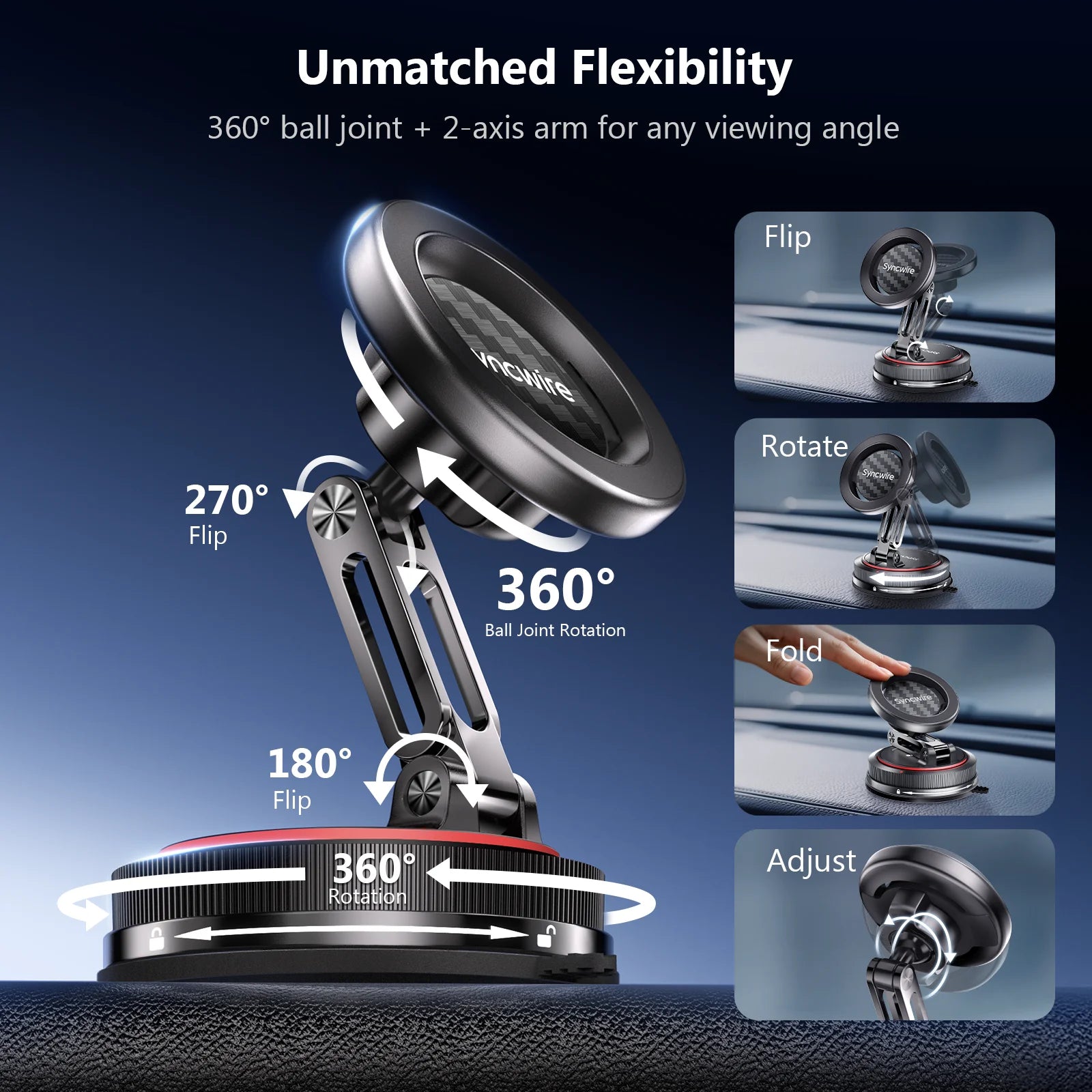 - Vollständig verstellbar mit klappbarem 2-Achsen-Arm: Mit einem um 360° drehbaren Sockel, einem zweiachsig klappbaren Arm und einem abnehmbaren magnetischen Kugelgelenk lässt sich Ihr Smartphone in jedem beliebigen Winkel positionieren. Zusammengeklappt reduziert sich die Größe der Halterung um 50 %, wenn sie nicht benötigt wird – ideal, um den Innenraum Ihres Autos ordentlich zu halten.