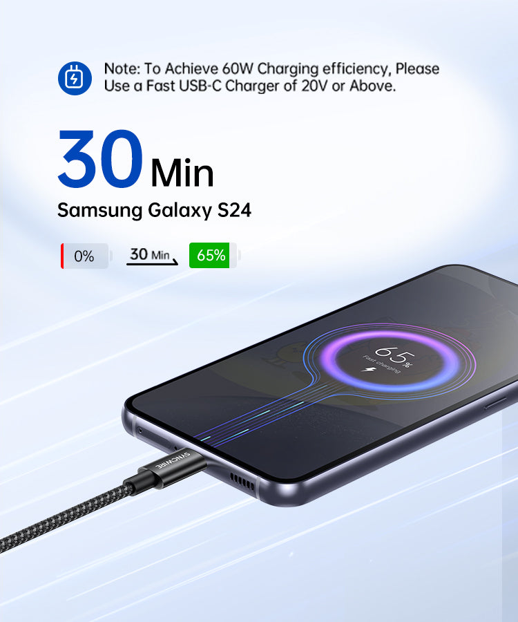 Schnelles Laden und Datensynchronisierung: Genießen Sie schnelles Laden mit PD3.0-, QC3.0- und QC4.0-Unterstützung, die bis zu 60 W Leistung und schnelle Datenübertragungsgeschwindigkeiten von 480 Mbit/s bietet. Laden Sie Ihr iPhone 15 Pro mit einem kompatiblen 35-W-Apple-Ladegerät in nur 30 Minuten auf 60 % auf.