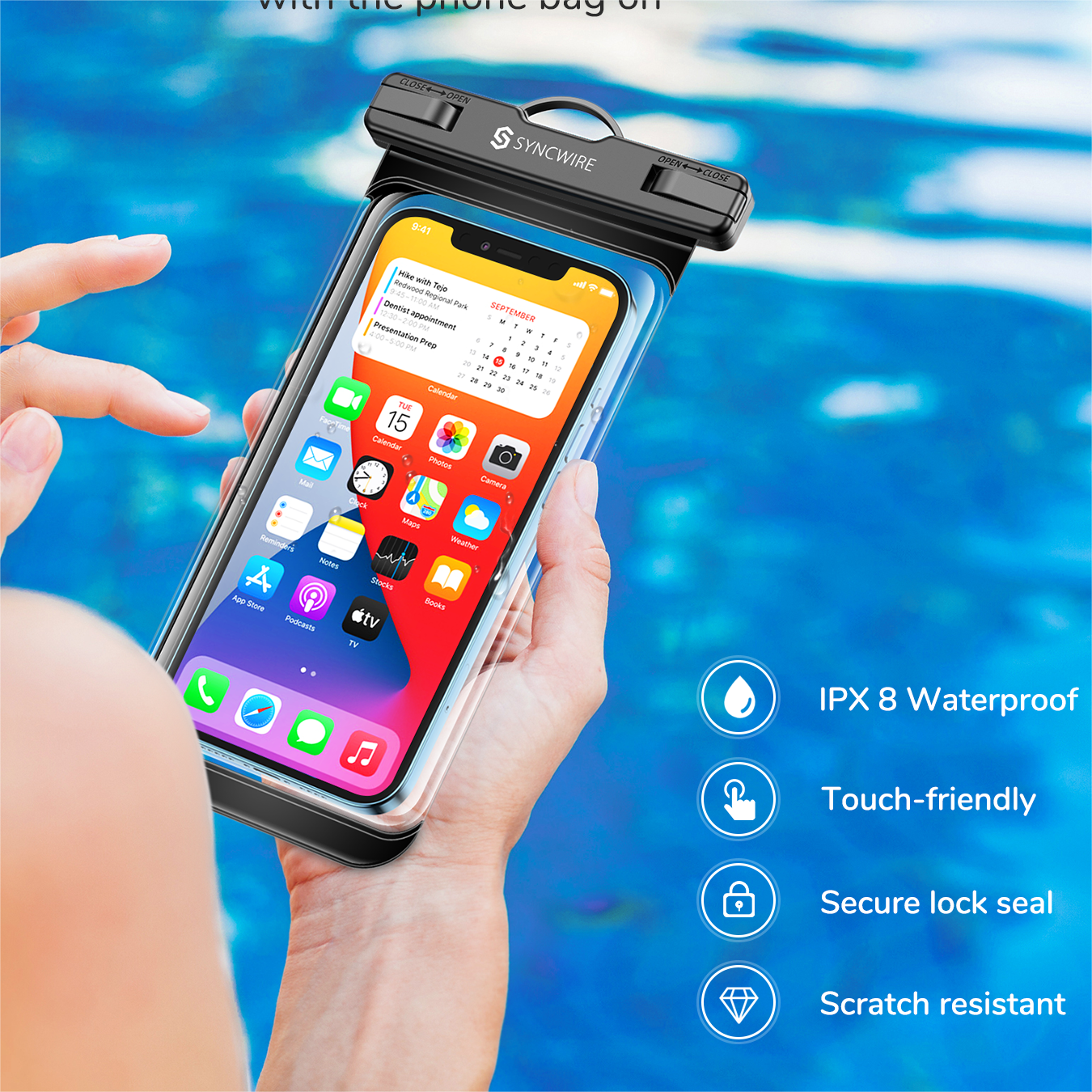 - bitte beachten SieHinweis: Diese wasserdichte Handyhülle ist nicht für Handys mit dicken Hüllen (z. B. Otterbox) geeignet. Bitte entfernen Sie solche Hüllen, bevor Sie das Handy in die Tasche legen. 2. Der Wasserdruck ab einer gewissen Tiefe kann die Funktion des Handys, beispielsweise des Touchscreens, beeinträchtigen. Drücken Sie in diesem Fall den Lautstärkeregler, um ein Foto aufzunehmen. 3. Kann nicht zum Entsperren per Fingerabdruck verwendet werden.